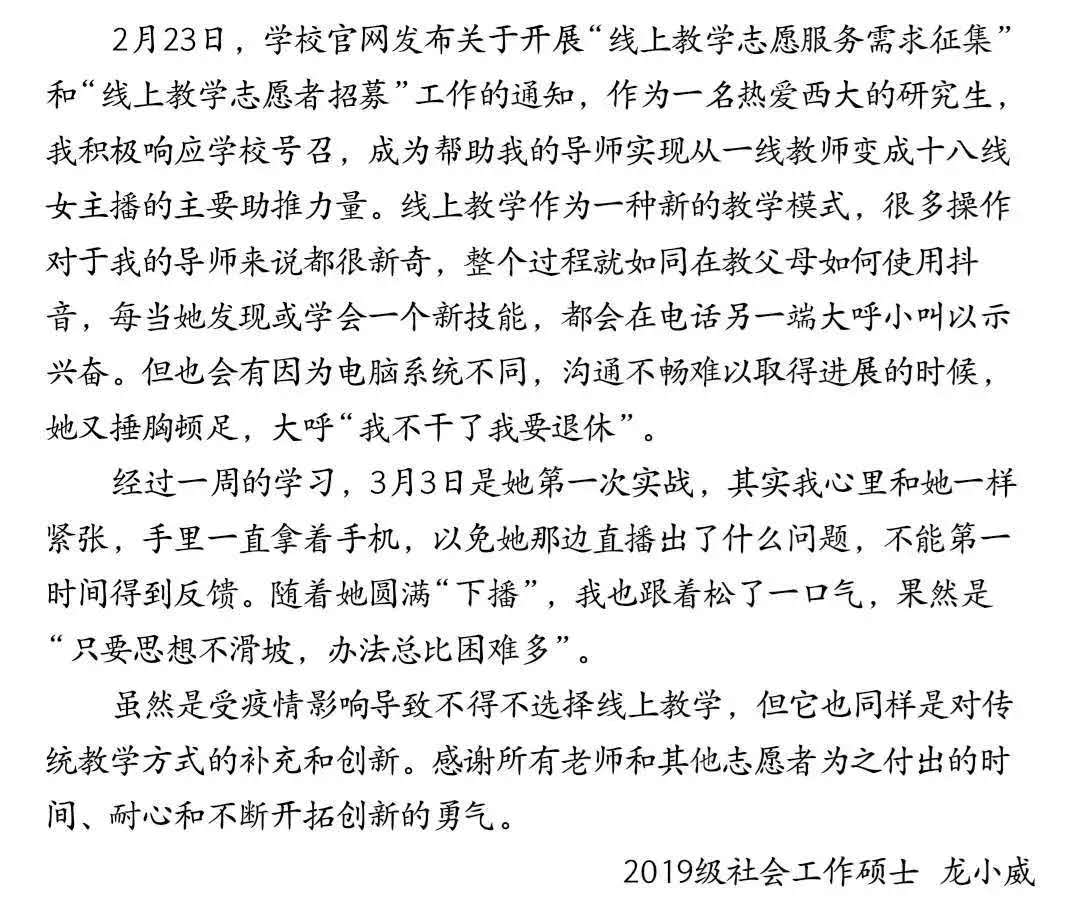 疫情发生以来,我院刘郑宁等多名学生积极参加了由我校团委组织的线上教学志愿服务活动,他们或协助老师进行线上教学,使得天南地北的同学和老师能够顺利汇聚在一起,为停课不停学提供技术保证;或为奋战在一线的西安第三医院医务人员子女提供义务家教服务,以便减轻医护人员的压力,为他们扫除后顾之忧,让他们能够以更好的状态投身抗疫战中。